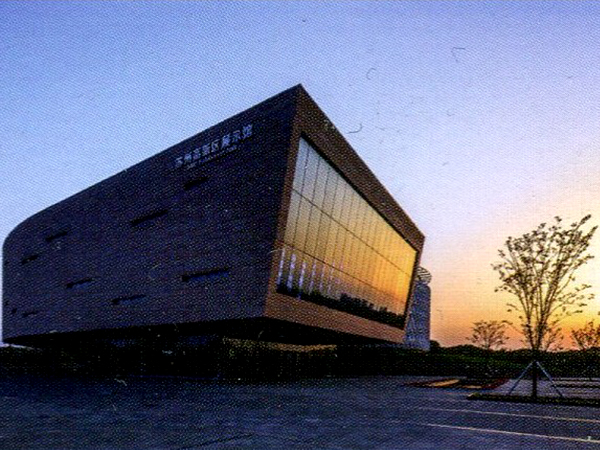 展示馆位于基地南部,有北侧人工湖泊岸广场中心确定的基地中轴线穿过展示馆的核心部分圆形的总规模型展示区,学术报告、会议功能区,主题单元功能区和临时展示区、综述厅、形象序厅布置在一个由地面逐渐升起的建筑体量中,由西南向北环绕总规模型展示区,一个大斜坡草坪由北侧偏西方向向上直通展厅,使人感觉整个大楼得到升高,使得大楼更加醒目。设计寓意为智慧之眼,审视新区的现在,展望光辉的未来。